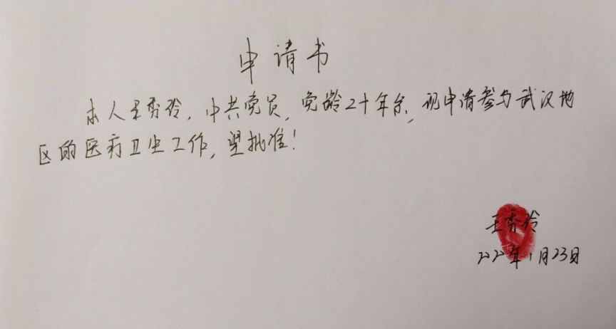 老王同志是山东省五莲县妇幼保健院有着将近三十年工作经验的资深妇产科大夫,常常自诩县城的年青人有三分之一是她接生的。1月23日,还在手术台上的老王同志听说了县卫健委号召医务工作者驰援武汉的消息,她有条不紊地结束了手术,急匆匆地掏出笔,写下了上面这封朴实无华的申请书,还因为着急上交找不到印泥所以用女儿送的圣诞礼物口红按了一个大大的指印。