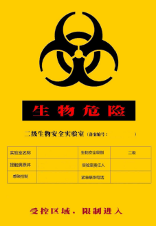 在生物安全实验室入口的明显位置必须张贴生物危害标志。标志上应明确标示实验室生物安全水平等级,实验室生物安全责任人、紧急联系方式等,见图2