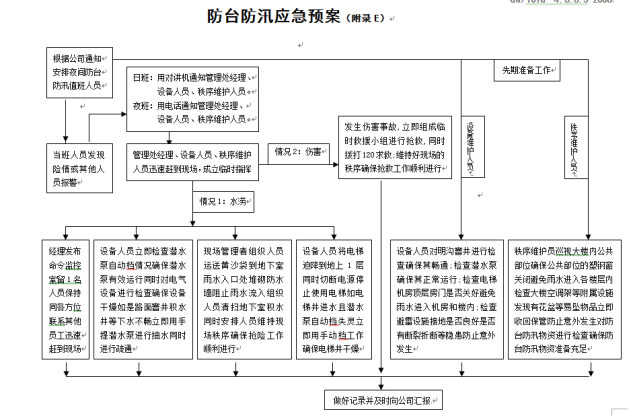 4) 遇暴雨、台风等突发性灾害天气时,抢险小组迅速到位,按照公司的应急预案,及时检查疏通排水管道,做到排水畅通;对大楼内部和地下室积水情况进行监测,及时报告灾情,及时组织足够的临时排涝设备进行强排。确保大楼正常的生活秩序和财产安全。