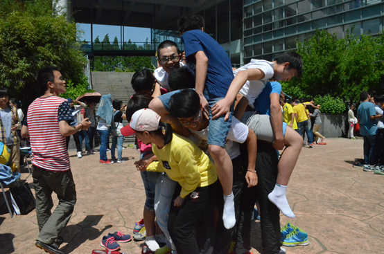 首先进行的项目是趣味叠罗汉,这个项目利用到了现在风行的指压板,每个队伍将分到一块60cm*80cm的指压板,由班长组织在2min内将班里同学尽可能的合理的安排至此指压板上,要求所有在指压板上的同学只能从指压板或指压板上的同学身体上借力,不能有其他任何部位如手、脚等触碰地或其他非指压板的地方。待不再向指压板上加同学后开始计时,坚持10s算完成。最后以指压板上同学的数量记成绩。在这个项目就是大家比拼智慧与勇气的时候了。最后在一块连一平方米的指压板上居然上去了20个人,在场的小伙伴们都已经惊呆了。