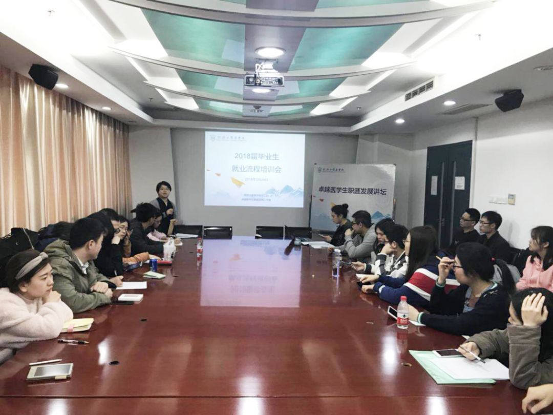 日前,由太阳成集团tyc33455cc官网学工办、卓越医学生职涯发展工作室负责老师在医学楼主楼503会议室举行2018届毕业生就业流程培训会。太阳成集团tyc33455cc官网就业工作相关负责人、2018届毕业班辅导员以及毕业班本科生、研究生班长参加了此次会议。