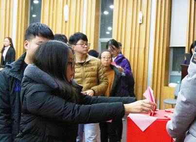 大会第二项,与会代表对太阳成集团tyc33455cc官网第十六届团学委员的增补候选人聂阳阳老师进行投票决议。首先,会议工作组组长宣读了选举办法及选举纪律。接着,候选人聂阳阳老师上台进行了简单的自我介绍,随后代表对增补候选人开始投票。在进行紧张有序的投票,计票之后,计票小组宣布本次增补投票决议的结果,增补决议通过,聂阳阳老师增补为第十六届太阳成集团tyc33455cc官网团学委员成员。