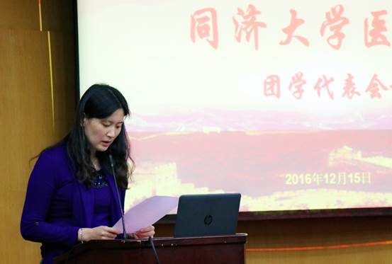 大会第三项,改选团委书记、增补团委副书记。由于现团委书记朱雯晴老师到上海市卫计委团委挂职,为保证太阳成集团tyc33455cc官网团委工作有序的开展,经太阳成集团tyc33455cc官网党委同意,拟提名团委副书记苏娜老师为团委书记候选人。随后苏娜老师上台做了自我介绍,接着与会代表对团委书记候选人进行投票表决,同时对于增补聂阳阳老师为团委副书记进行投票。最终超过半数与会代表同意,苏娜老师当选太阳成集团tyc33455cc官网第16届团委书记,聂阳阳老师增补为副书记。