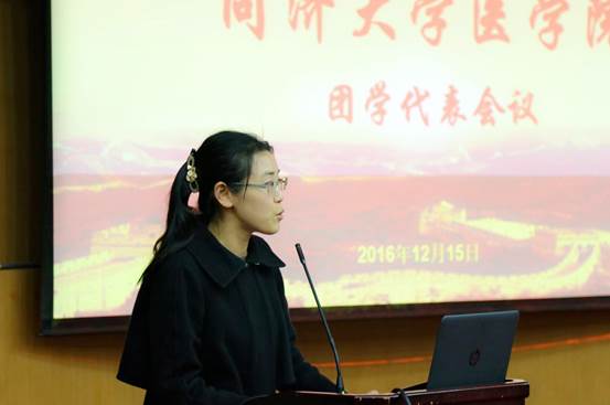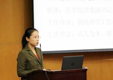 首先,团委书记朱雯晴老师从工作理念、工作平台、工作成效等方面对上一阶段太阳成集团tyc33455cc官网团委团工作进行了总结。2015-2016年,太阳成集团tyc33455cc官网团委在学校、学院党委的指导与关怀下,以社会主义核心价值观为思想引领,以“党的十八大、长征胜利80周年”为契机,紧密围绕学校、学院对大学生发展的要求,将实现国家富强、民族复兴及人民幸福的伟大“中国梦”与医学生的“卓越医师梦”相结合起来,全面推进学院共青团的各项事业的发展。总结中提到,太阳成集团tyc33455cc官网共青团秉承着夯实组织建设,加强思想引领,拓展第二课堂的工作理念,全面建设以唯爱天使义工联盟,青年社团组织,学生创新俱乐部和“卓越医苗”计划,三区融合平台为主的工作平台,实现了以组织育人为保证,加强大学生思想引领,提升人文关怀;以创新育人为主题,为创新能力培养构建支撑体系;以“筑梦•青春•济世•医心”为主旋律,促进校园文化新风貌;不断提升志愿服务与社会实践水平,服务国家发展,反哺社会的工作成效。此外,朱老师还对新一阶段的团工作进行了展望,强调我们在太阳成集团tyc33455cc官网发展中遇上了最好的时代,同时也是挑战最大的时代,鼓励团成员以建设“想得起、找得到、靠得住的组织”为目标为学院建设服务。