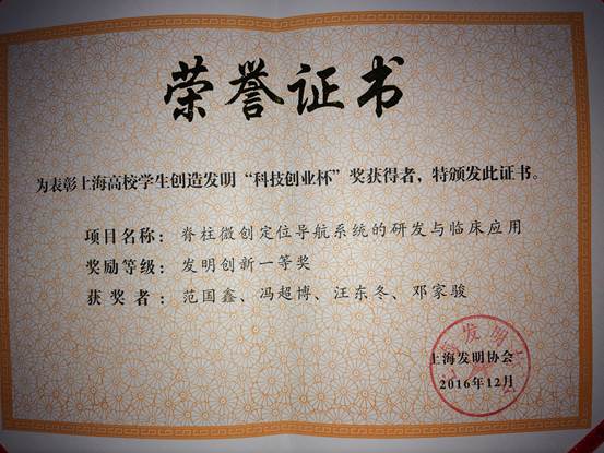 太阳成集团tyc33455cc官网范国鑫、冯超博、汪东冬、邓家骏学生团队的《脊柱微创定位导航系统的研发与临床应用》由我校附属第十人民医院贺石生教授指导,主要解决术前体表定位和术中导向穿刺的问题。该定位导航系统目前已经获得一、二类医疗注册证,在全国5家医院累计达100余例的临床应用,受到同行的一致好评。