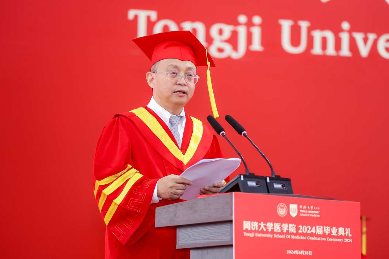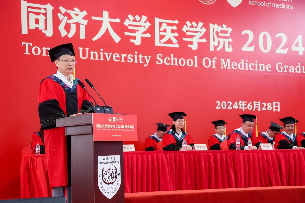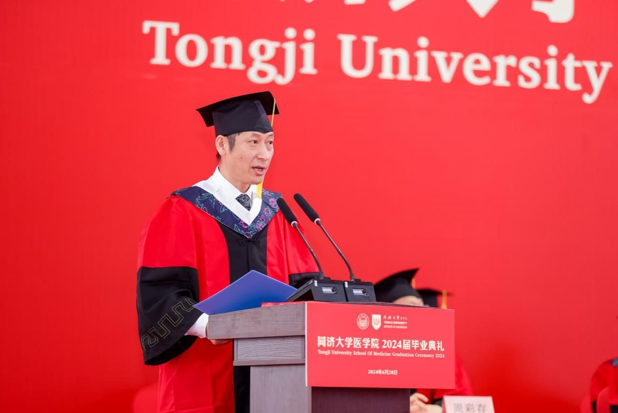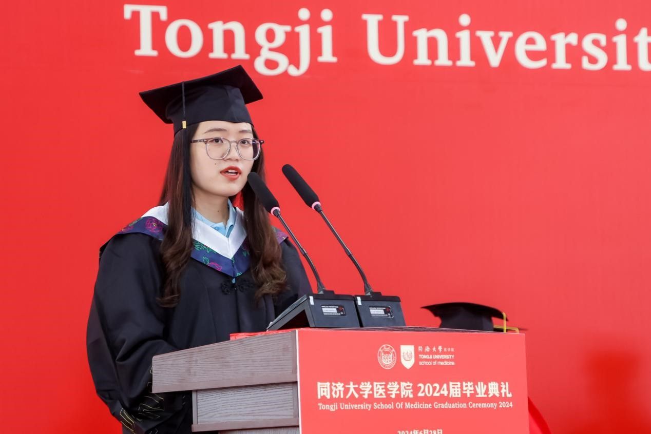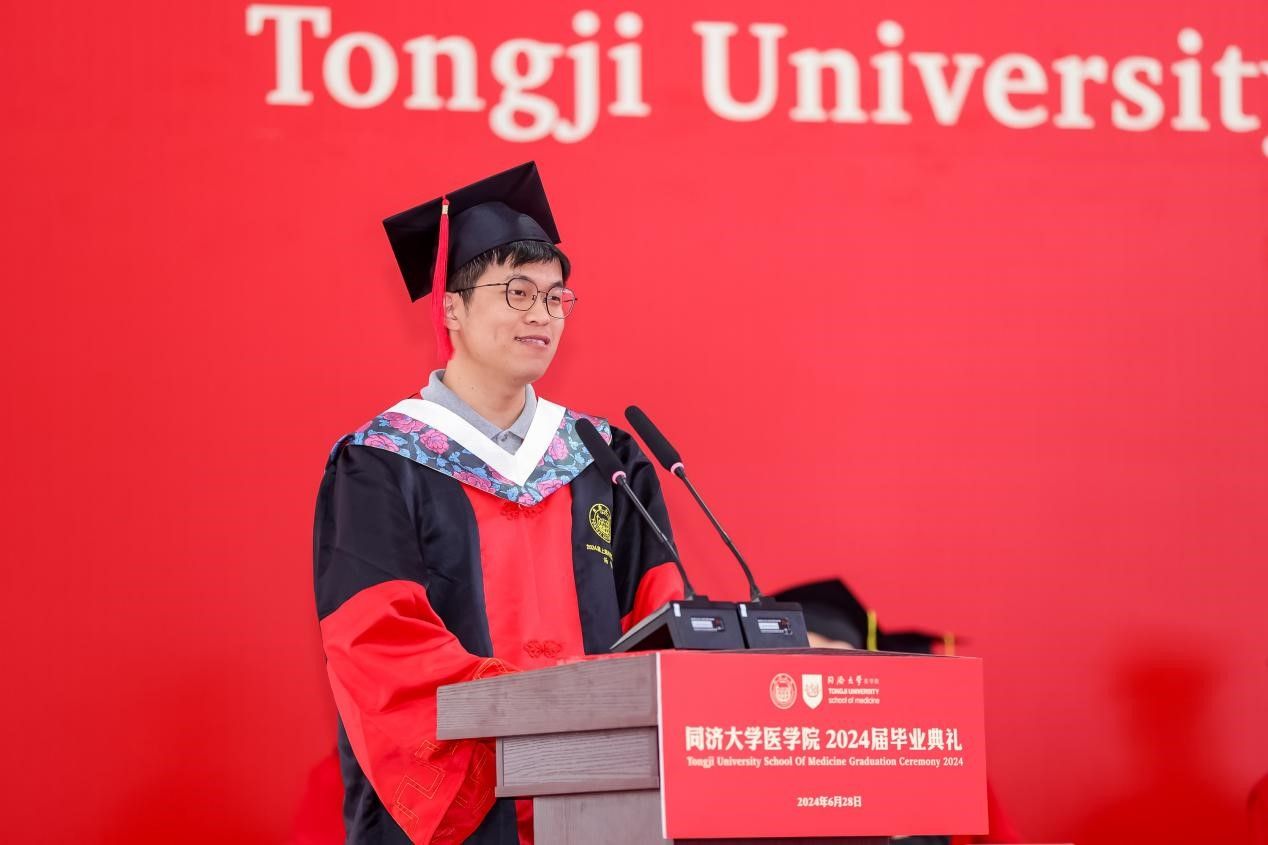 研究生代表、上海市优秀毕业生获得者、2024年太阳成集团tyc33455cc官网追求卓越学生提名奖获得者、2019级博士生汤海感谢这一路来所有提供帮助的老师、家人、同学和朋友,向母校和学院表示真诚的感激和临别的不舍,表示面对挑战与压力,同医人从未退缩,因为深知唯有不断努力和坚持,方能成就真正卓越的医学人才。