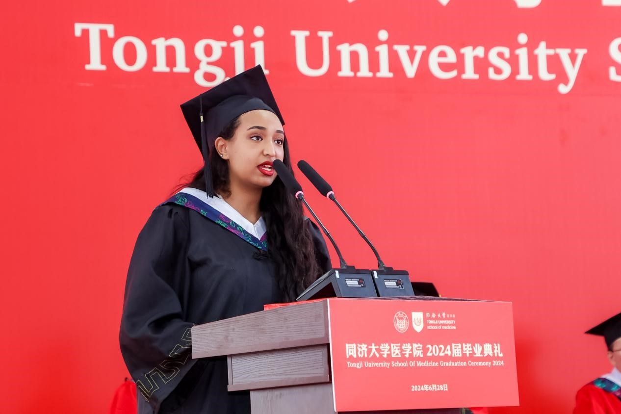 留学生代表、来自埃塞俄比亚的2018级MBBS优秀毕业生代表何丽娜同学上台发言,表达对母校的辛勤栽培的感激,以及对即将在毕业后开启富有挑战的职业医师生涯的期待,未来从医路上要将“医者父母心”的职业医师精神贯穿始终。