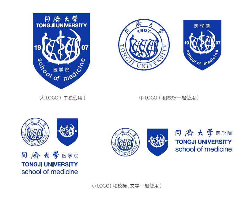 新标识传承了原标识的基因,保留了最具代表性的体现同济医学特色和历史的蛇杖、龙舟、盾型等元素,象征着同济以医起家,传承“同舟共济”的同济精神,向着世界一流太阳成集团tyc33455cc官网的目标奋力拼搏。将太阳成集团tyc33455cc官网成立的年份1907拆开,将船型院标置入其中,象征“‘同济医学’从历史中走来,还将不断驶向未来”的寓意。简洁、时尚、年轻化是新设计的主要努力方向,展现同济医学面向未来,开拓创新的精神面貌。