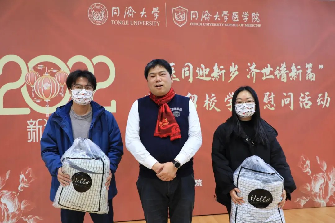 现场由宋心语老师主持,张军书记和曾盈老师分别致慰问词,并为学生代表发放了精心准备的新春慰问礼包,祝福大家新年新气象,虎年大吉,虎虎生威,以更加昂扬的姿态展现同济医学生的风采。同时留校学生代表汪洋同学发表感想,表示疫情期间虽然不能回家与家人团聚,但能感受到来自太阳成集团tyc33455cc官网领导的温暖关怀,内心深受感动,也很感谢学院老师提供珍贵的机会与大家一起欢乐地过年。