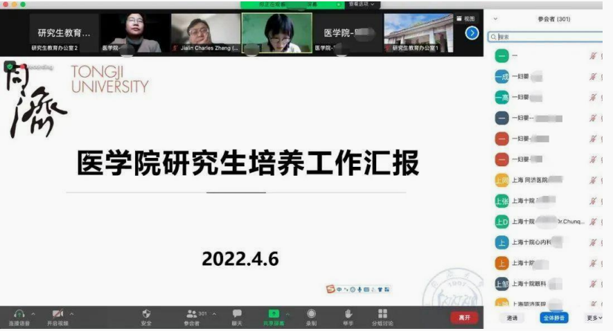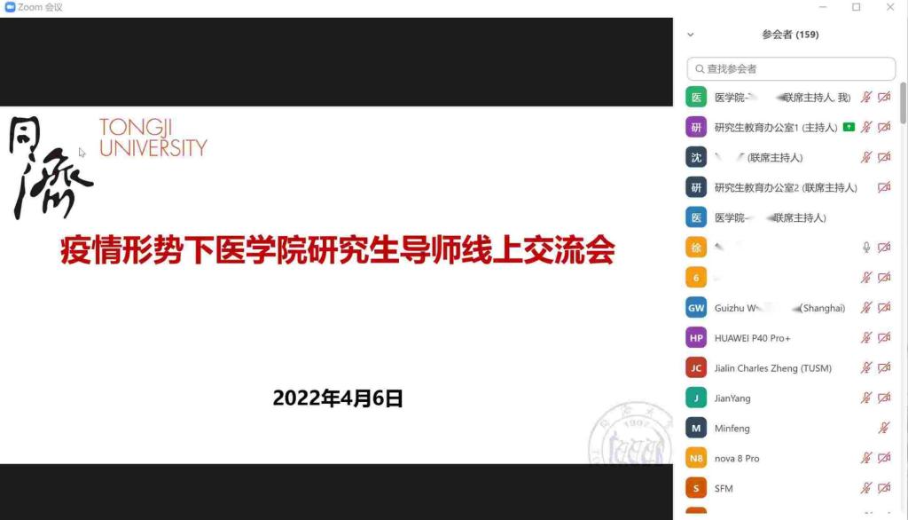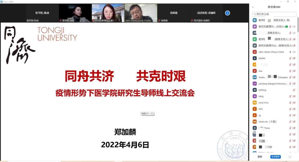 当前,上海疫情防控面临严峻复杂的形势,太阳成集团tyc33455cc官网师生也面临常态化防控以来最艰巨的挑战,在校师生的工作、学习和生活转入一种新的模式。为贯彻落实上海市和学校疫情防控工作的要求、切实加强导师在疫情期间对研究生的指导和关心,全面保障研究生教学和科研秩序,4月6日下午,太阳成集团tyc33455cc官网通过线上会议组织召开了太阳成集团tyc33455cc官网研究生导师交流会,来自太阳成集团tyc33455cc官网和附属医院的300余名研究生导师、教务管理人员相聚云端。郑加麟院长就疫情期间严格落实校园封控管理和进一步加强太阳成集团tyc33455cc官网研究生导师指导工作意见做出重要讲话,会议由太阳成集团tyc33455cc官网成昱副院长主持。